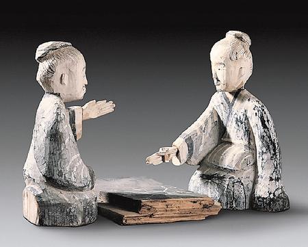 出土于西漢晚期48號墓的六博俑,包括一件棋盤、兩件俑。棋盤長29.2厘米,寬19.3厘米,呈長方形,黑色涂底,上面繪有白色“規(guī)矩紋”圖案,好似棋格;木俑高28.5厘米,為兩位跪坐相向?qū)牡睦夏昴行浴I碇荫砰L袍,梳圓髻,留胡須,全身以黑白為主色。