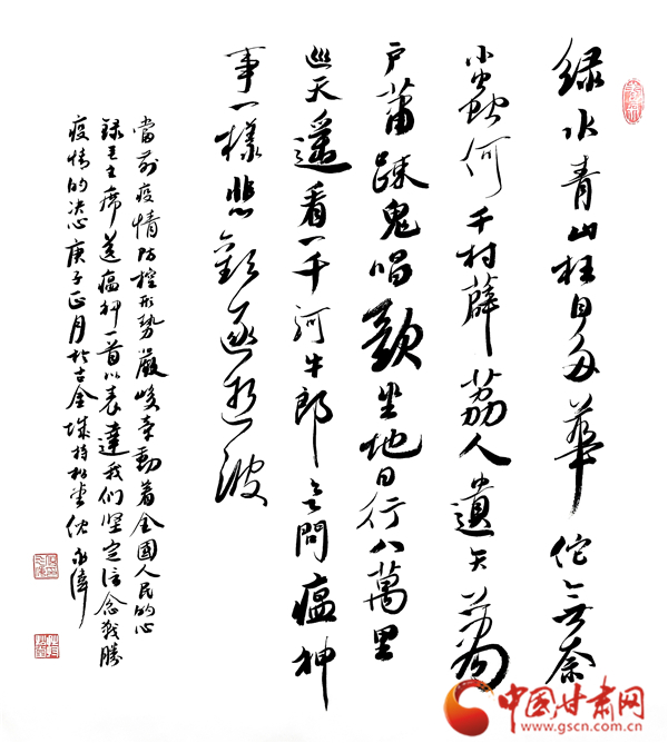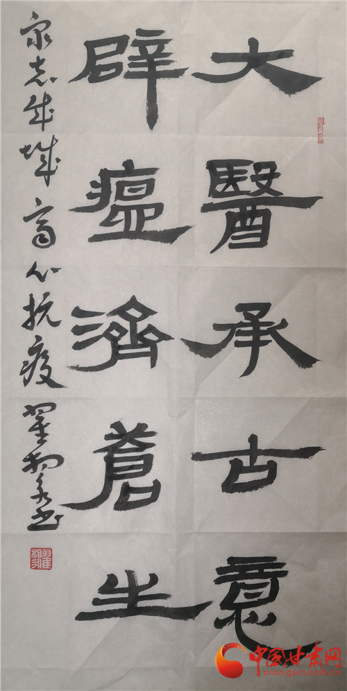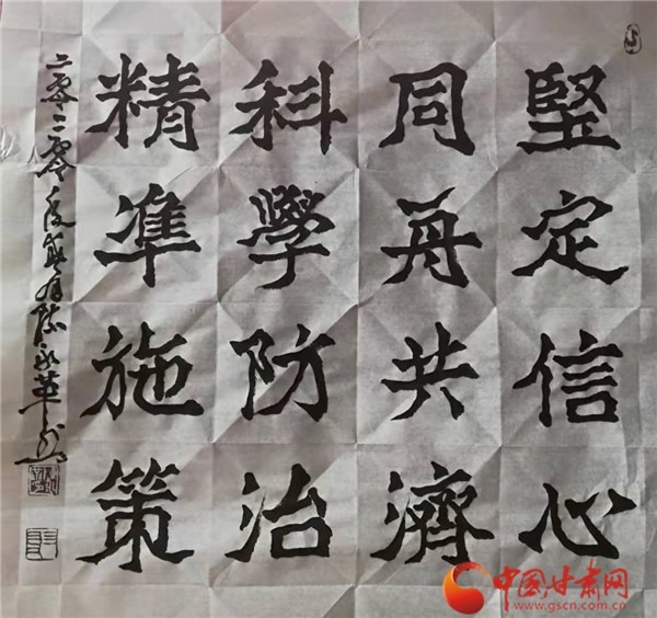 中國甘肅網(wǎng)2月12日訊(本網(wǎng)記者 張?zhí)m琴 張玉芳)2020年新春,面對突如其來的新冠肺炎疫情,全國人民正在以必勝的信心全力打贏這場沒有硝煙的戰(zhàn)爭。翰墨傳情,為抗疫助力。2月11日,由甘肅省文聯(lián)主辦,甘肅省文聯(lián)所屬文藝家協(xié)會、中國甘肅網(wǎng)承辦的甘肅文藝界戰(zhàn)“疫”主題作品展播活動正式啟動。我省12位書法大家揮毫潑墨,這些作品為所有奮戰(zhàn)在抗疫一線和防控疫情工作的平凡天使加油鼓勁,祈禱祝福,用文藝凝聚起抗擊疫情的強大精神力量,為我省防控疫情宣傳助力,受到了社會各界的贊譽。