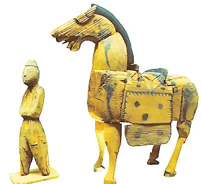 張掖市高臺縣駱駝城遺址出土的胡俑牽馬木雕。