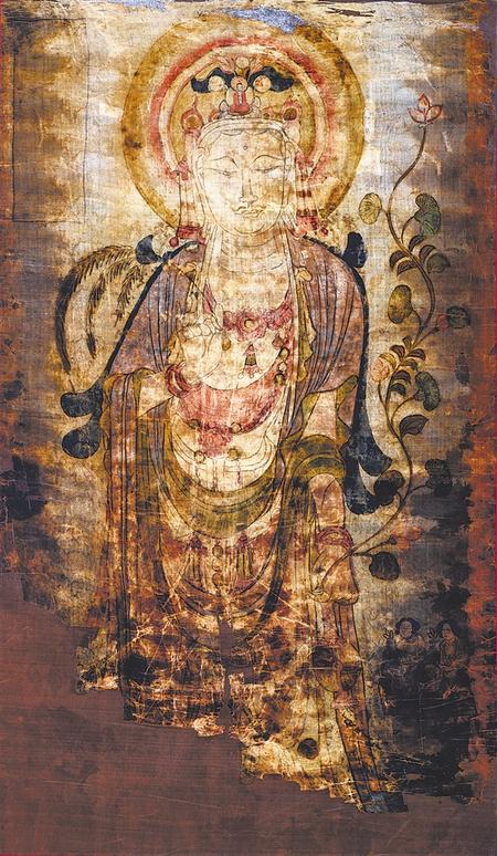 此像雖然褪色嚴(yán)重,殘缺不全,卻是敦煌絹畫中極為精美的佳作。觀音菩薩面朝前方,腰肢微扭,左肩前傾。面部輪廓清晰雅致,大耳垂肩,雙目微斂,神態(tài)慈悲安詳。右手持柳枝,左手提凈瓶,彎曲的長(zhǎng)莖從瓶口伸出,蓮莖與觀音的站姿相呼應(yīng),搖曳向上在左肩上方開(kāi)出一朵含苞紅蓮。畫面右下方跪有持蓮花女供養(yǎng)人像二身,她們衣著發(fā)型簡(jiǎn)樸。其邊緣和畫面下部缺損嚴(yán)重,上部和兩側(cè)保存較完整,左上角長(zhǎng)方形榜題呈空白。整幅畫面造型柔美繁復(fù)、勾勒緊勁嚴(yán)謹(jǐn),衣帶翻轉(zhuǎn)飄舞,線條行云流水,疏密有致,加之斑斕的色彩,令畫面熠熠生輝。