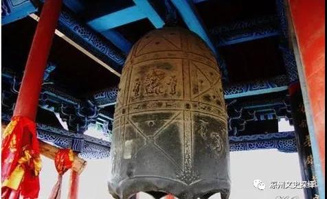 大云寺古鐘,高226厘米,口徑115厘米,厚12厘米,重約6噸,懸掛于武威大云寺鐘樓上。其鑄造時代傳說各異,或云前涼張?zhí)戾a時所鑄,或云為唐代遺物,而最晚者謂鑄于五代。