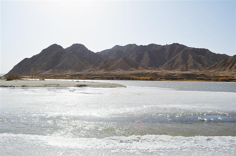 找到離它最近的路段,停下車,我踩著河沙到近處一睹它的容顏。它水量的豐沛超出了我的想像,岸邊是晶瑩剔透的河冰,再往中間便是汩汩流淌的河水了,河面有的地方寬達(dá)二三十米,在它兩邊,河水浸潤之下,便滋潤出成串的濕地,有蘆葦茂盛得像是江南水鄉(xiāng)。