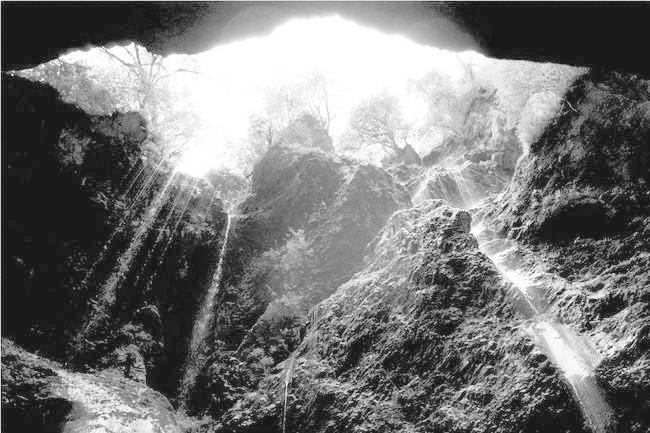 天井峰是整座天井峽的最高點(diǎn)。距天井峰不遠(yuǎn)處,有一股噴涌而下的泉水飛流直下,正好激濺在一塊奇石上,日積月累,石上竟沖刻成一個融隸、篆、草為一體的天然“幽”字,這塊巨石也就被稱為“幽”字石,因此天井峽又被稱為“天井幽谷”。