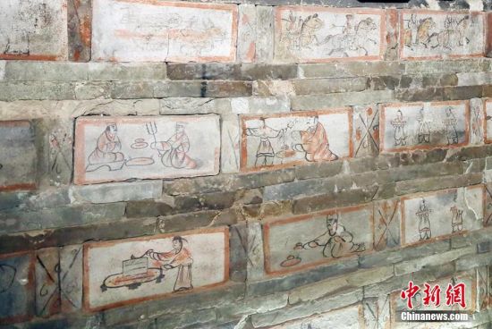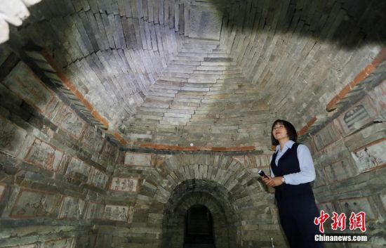 位于甘肅嘉峪關市的嘉峪關新城魏晉墓群,內有千余座魏晉古墓,從1972年起,先后發(fā)掘18座,其中9座為畫像磚墓。磚壁畫取材于現實生活,用連環(huán)畫的方式反映出了當時河西地區(qū)生活、生產、軍事、文化的真實情景,具有濃厚的生活氣息。目前只開放的六號墓,其壁畫內容豐富,具有很強的代表性。高展 攝