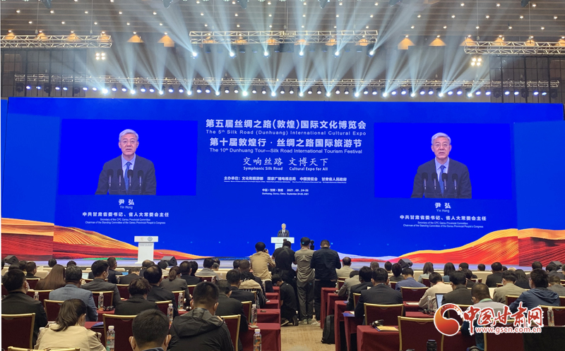 中國甘肅網(wǎng)9月24日訊(本網(wǎng)記者  宋芳科 楊亞楠 張振國)9月24日上午,第五屆絲綢之路(敦煌)國際文化博覽會和第十屆敦煌行·絲綢之路國際旅游節(jié)開幕。本屆“一會一節(jié)”由文化和旅游部、國家廣播電視總局、中國國際貿(mào)易促進委員會、甘肅省人民政府共同主辦,以“交響絲路 文博天下”為主題,旨在進一步加強“一帶一路”人文交流的官方合作和民間往來,增進共建“一帶一路”國家的文化認(rèn)同。中共中央政治局委員、中央書記處書記、中宣部部長黃坤明以視頻方式發(fā)表主旨演講。