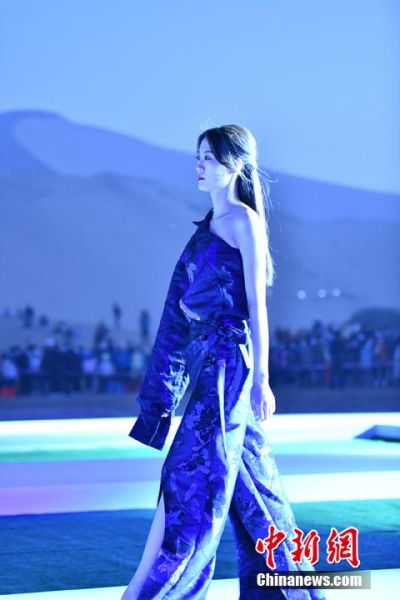 10月16日晚,敦煌國際時尚周在鳴沙山月牙泉景區(qū)開幕,張肇達·張凱惠攜手的作品在這里進行了展演秀。圖為敦煌服裝秀展示。 殷春永 攝