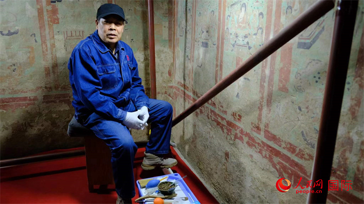 敦煌研究院文物保護修復工作者劉濤在工作現(xiàn)場。人民網(wǎng) 呂強攝
