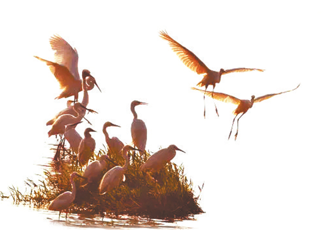 去年12月底,一位老師來西峰講學(xué),我陪先生到濕地海綿公園轉(zhuǎn)悠,剛剛步入人行道,發(fā)現(xiàn)遠(yuǎn)處湖水中央有七八只白鷺在棲息,朝陽斜射到湖面上,水波瀲滟,像細(xì)碎的金斑,白鷺安詳?shù)叵礈熘鹈?,有一只白鷺單腿直立著,恰似依著一根筆直纖細(xì)的鐵絲,半張著翅膀,欲飛不飛的樣子,剩下的幾只白鷺在戲水,迷人極了。