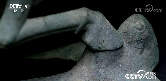 我整器由馬與飛鳥構(gòu)成,一匹正在急速飛奔的駿馬,身高34.5厘米,身長45厘米,全身呈流線型,肌肉健碩有力。馬的三足騰躍在空中,一足踏上飛鳥。飛鳥不知后面追上來的是什么,驚回首的一剎那間,馬已經(jīng)超在了前面,這馬踏飛燕(馬超龍雀)夢幻般的瞬間被定格成為永恒。