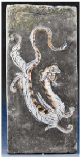 這件高臺(tái)縣博物館館藏的漢晉彩繪虎畫像磚,長(zhǎng)42.5厘米,寬20厘米,厚6.5厘米,出土于駱駝城苦水口1號(hào)墓葬,屬國(guó)家二級(jí)文物。作為“四神”形象之一,多見于墓葬中磚砌門飾構(gòu)件之上。