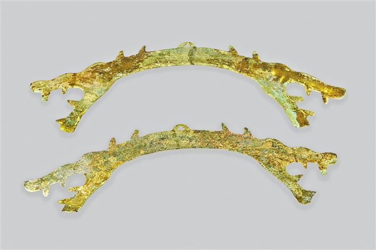 此套鎏金龍虎飾件中的虎飾件:長36.1厘米,寬9厘米;龍飾件:長41厘米、寬7.7厘米。為春秋戰(zhàn)國時期龍、虎形銅璜,圓拱形,頂部之上有拱形穿,兩端分別為龍首與虎首,口部張開,露出尖牙。在新石器時代,璜一般是佩戴于胸頸部的裝飾品,具有象征身份地位的作用。