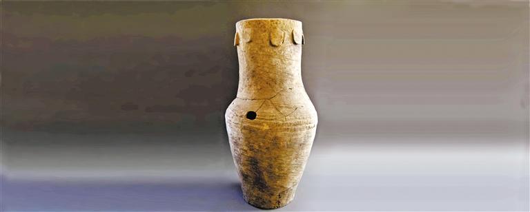 繩紋灰陶鼓直頸、鼓腹、平底,器型碩大,口徑30厘米,通高87厘米,地徑27厘米,是新石器時代馬家窯文化時期馬家窯類型。
