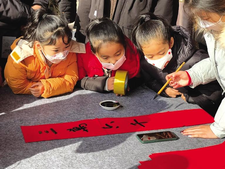“千門(mén)萬(wàn)戶曈曈日,總把新桃換舊符”。書(shū)法老師們提筆蘸墨,行云流水,落筆如云煙,寫(xiě)成了一副副寓意吉祥美好的春聯(lián)。孩子們懷著一顆顆憧憬之心,圍繞在老師們的周圍,幫忙擺放、晾曬春聯(lián)。最后,孩子們將老師寫(xiě)好的春聯(lián)送給了爸爸媽媽,以及前來(lái)參觀的游客們。