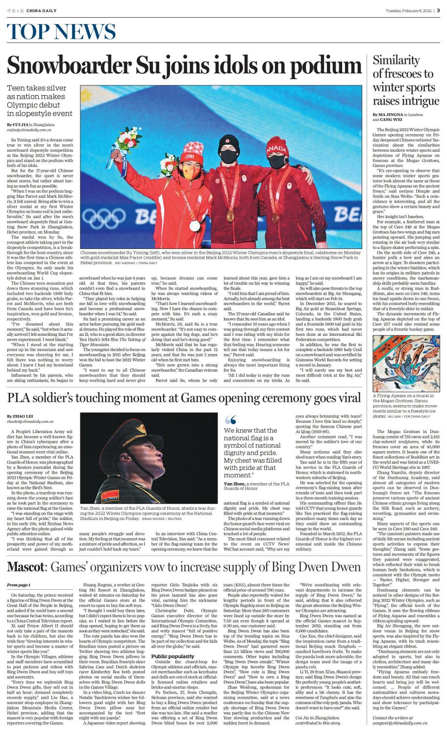 《中國(guó)日?qǐng)?bào)》2月8日三版,對(duì)敦煌莫高窟壁畫與冬季運(yùn)動(dòng)的相似性進(jìn)行了報(bào)道。