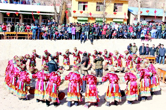 在岷縣,巴當(dāng)舞只在中寨鎮(zhèn)的古莊村、扎那村牙地社和一路村流傳,尤其古莊村最為鼎盛且具規(guī)模。這里毗鄰卓尼縣藏巴哇鎮(zhèn),藏漢兩地僅一公里之遙,情感相連,民心相通。長期以來,群眾在經(jīng)濟(jì)、文化、婚姻等方面交流密切。時(shí)至今日,扎那、古莊等村群眾春節(jié)吃肉仍遺留著藏民族彪悍豪爽的風(fēng)格:一大盤“手把肉”端上來,上面插一把小刀,客人可以自削自啖,這種神秘的文化符號似乎無聲訴說著藏漢兩地的過往、發(fā)展和變遷……