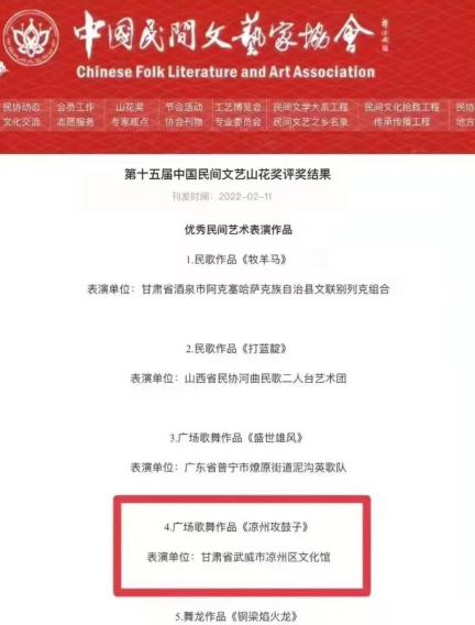 中國甘肅網(wǎng)3月14日訊(本網(wǎng)記者 張振國)近日,第十五屆中國民間文藝山花獎評獎結(jié)果公示,由武威市舞蹈家協(xié)會副主席付泓創(chuàng)作、武威市涼州區(qū)文化館表演的作品《涼州攻鼓子》榮膺該獎。該獎項的獲得,是武威市文藝創(chuàng)作和非遺保護(hù)傳承的又一優(yōu)秀成果。