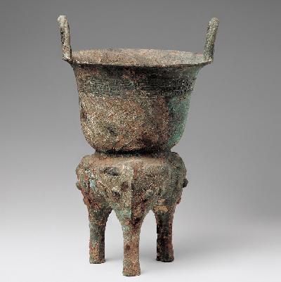 分襠三足,束腰雙柱,牛首鋬,素面,頸部飾弦紋。鋬內(nèi)族徽下有銘文。