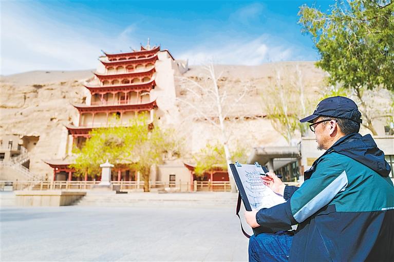 游客在莫高窟前寫生。