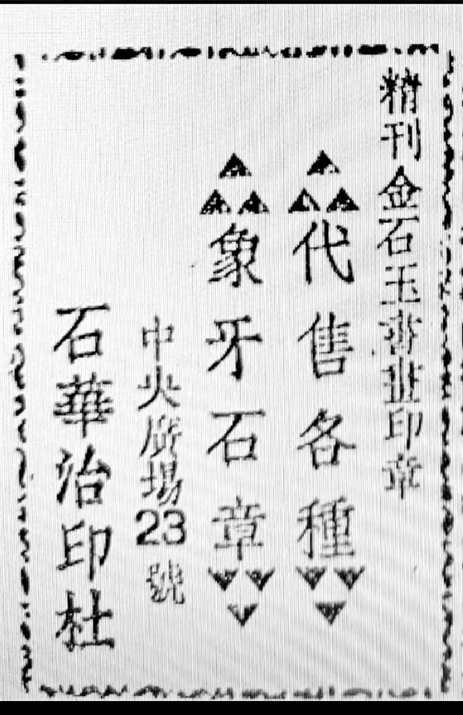 最后要提到的一則廣告也與文化有關(guān)。蘭州和平日報(bào)社1947年出版的《新蘭州》一書中,曾刊登石華治印社廣告,其廣告詞曰:“精刊金石玉書畫印章、代售各種象牙石章”,社址在中央廣場23號,其創(chuàng)辦者即為隴右印壇名宿駱石華先生。駱石華先生1920年生人,彼時(shí)未及而立,尚未入白石先生門下;筆者家外祖解放前供職中央廣場郵局,當(dāng)年曾與石華先生相交。今偶于舊籍中覓得石華治印社當(dāng)年廣告,恭錄于此,既為本文收尾,亦為家外祖與石華先生半個(gè)世紀(jì)友誼之緬懷。
