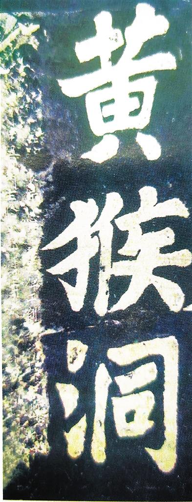 石刻為長方形,上邊深0.1米,其他三邊深約0.05米,長0.87米,寬0.4米,中間豎書“黃猴洞”三字,陰文,各有0.23米-0.29米大小?!队苤锌h志》記載石刻內容為:“齊獲睹經(jīng)略少保恩公墨跡,俾工刻石,以傳不朽”,落款為“政和戊戌六月十五,門生修武郎權知蘭州龕谷寨向齊上石”,石刻簡約記述了“黃猴洞”三字的來歷,是出自北宋政和八年(1118年),龕谷知寨向齊讓工匠將其師題字刻鐫于此。