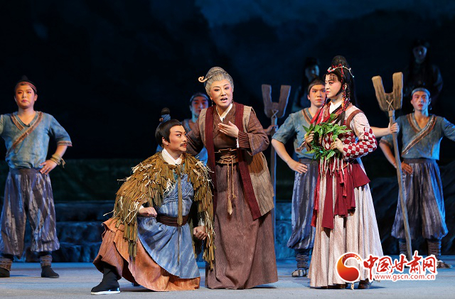 隴劇《大禹治水》是在甘肅省文化和旅游廳全程指導(dǎo)下,《黃河流域生態(tài)保護(hù)和高質(zhì)量發(fā)展規(guī)劃綱要》出臺(tái)之際,甘肅文藝工作者挖掘黃河文化蘊(yùn)含的時(shí)代價(jià)值,講好“黃河故事”,實(shí)施隴原文藝高峰攀登工程、加強(qiáng)非物質(zhì)文化遺產(chǎn)保護(hù)傳承的具體行動(dòng)。該劇將“大禹”這個(gè)上古英雄請(qǐng)下神壇,為他賦予了親情、愛(ài)情、家國(guó)情懷,在兩個(gè)小時(shí)的演出中,領(lǐng)銜出演“大禹”的優(yōu)秀青年演員邵炳德與雷通霞、竇鳳霞、佟紅梅等“三朵梅花”同臺(tái)飆戲,火花四濺的“開(kāi)山”、扣人心弦“治水”,將大禹和先民們不畏艱險(xiǎn)、篳路藍(lán)縷的開(kāi)拓精神和奮斗精神,演繹得淋漓盡致,深深震撼著現(xiàn)場(chǎng)觀眾。而隴劇音樂(lè)獨(dú)有的“麻簧”、以皮影戲?yàn)楸憩F(xiàn)手法的“月下婚禮”場(chǎng)景、水袖舞場(chǎng)景,把人物的情緒表現(xiàn)得栩栩如生,將獨(dú)具特色的隴劇藝術(shù)盡情綻放在舞臺(tái)之上。