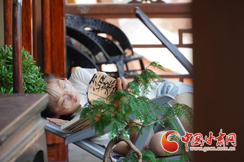 天水古城一家店門前,有一位正在閱讀的女孩。