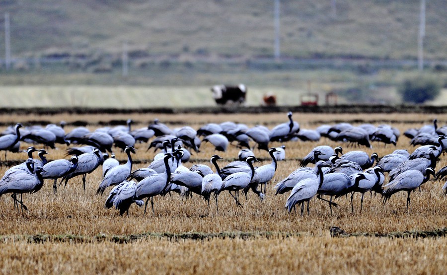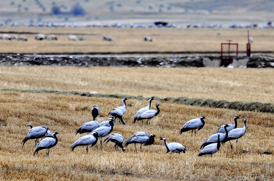 人民網(wǎng)蘭州10月10日電 (記者高翔)寒露至、候鳥遷,甘肅省肅南裕固族自治縣皇城鎮(zhèn)夏日塔拉草原迎來數(shù)千只蓑羽鶴,它們在濕地的水面上、草叢中或悠閑覓食、或蹁躚起舞,與色彩斑斕的草原構(gòu)成了一幅和諧優(yōu)美的生態(tài)畫卷。