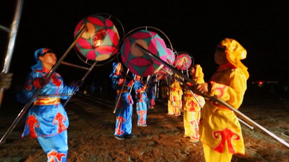 景泰滾燈由燈籠和燈架組成,燈籠分里外兩層,為圓形,外層轉(zhuǎn)動內(nèi)層固定,燈籠外層用彩紙或紗綢裱糊。表演者手執(zhí)燈架,輕輕一碰地面,燈籠便轉(zhuǎn)動起來。夜晚,彩燈滾動,猶若五彩斑斕的長龍,扭曲躍動,時慢時快,回頭擺尾往復(fù)盤旋,交響輝映,別有一番情趣。