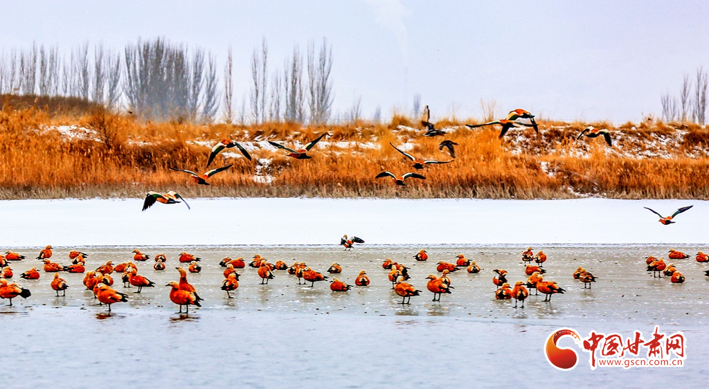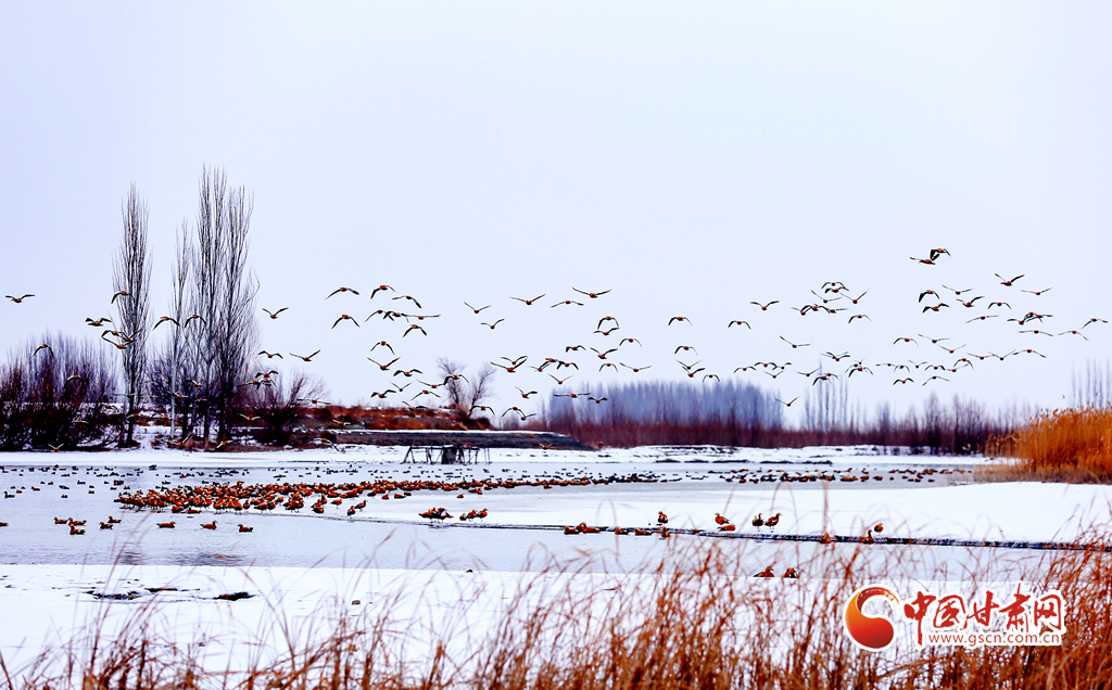 12月20日,在甘肅省酒泉市銀達鎮(zhèn)花園水庫,一群候鳥正在戲水、覓食,為祁連山下的戈壁大地增添了一道亮麗的景色。