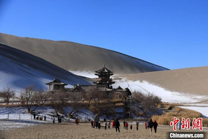 1月23日,游客在甘肅敦煌市鳴沙山月牙泉景區(qū)游覽。魏佳秀 攝