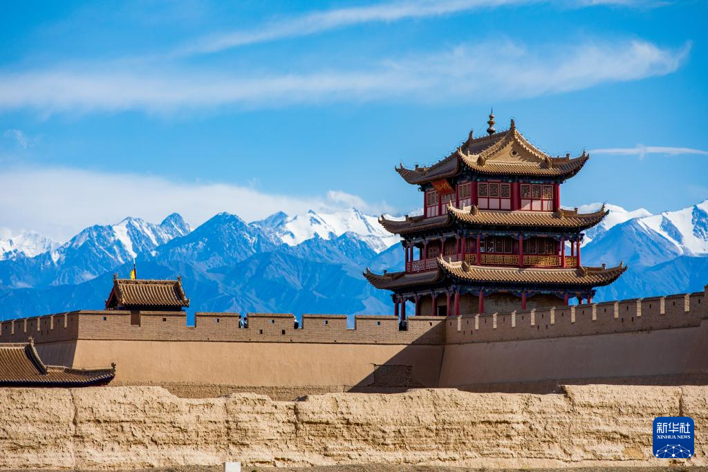 當日,位于甘肅河西走廊的嘉峪關市在一場疾風驟雨后,天空放晴,遠處祁連雪山與嘉峪關關城交相輝映,構成一幅壯美畫卷。