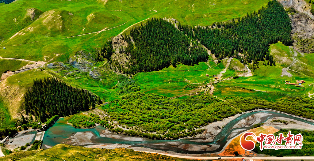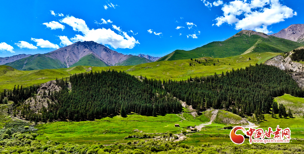 7月22日,祁連山國(guó)家公園甘肅省張掖市肅南裕固族自治縣大河鄉(xiāng)段,藍(lán)天白云下,巍峨壯麗的祁連山蒼松翠柏矗立其間,綠草如茵、水光粼粼,如同一幅壯美與秀麗并存的山水畫卷。