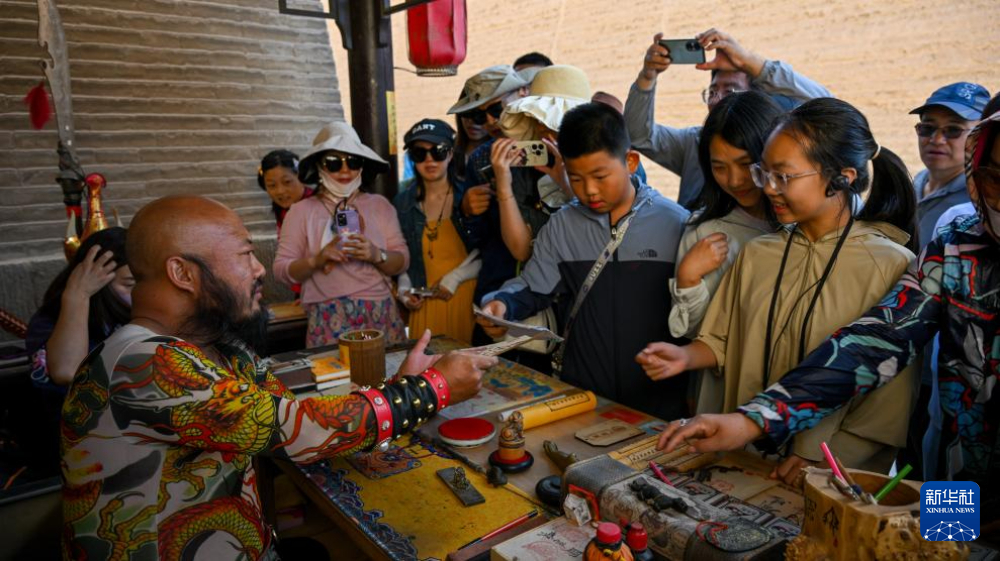 7月14日,在甘肅嘉峪關(guān)關(guān)城景區(qū),游客在李森的攤位前等待他“簽發(fā)關(guān)照”。新華社記者 陳鐘昊 攝