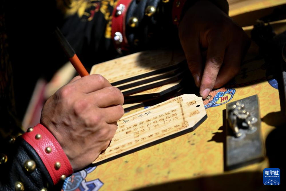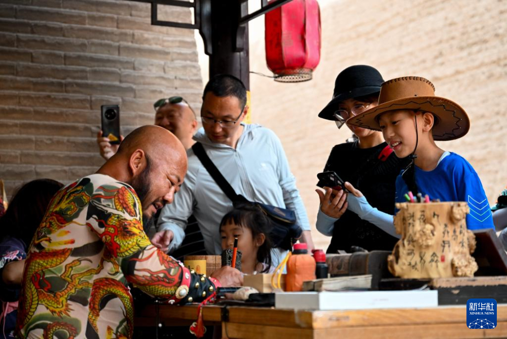 7月13日,在甘肅嘉峪關(guān)關(guān)城景區(qū),李森為游客手寫文創(chuàng)產(chǎn)品“關(guān)照”。新華社記者 劉金海 攝