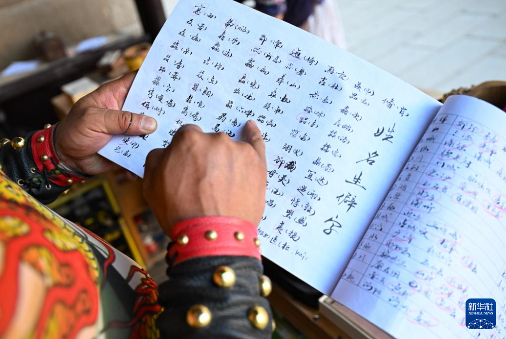 在甘肅嘉峪關(guān)關(guān)城景區(qū),李森在攤位上查閱自己編寫的含有生僻字讀音、城市古地名等內(nèi)容的小冊子(7月14日攝)。新華社記者 陳鐘昊 攝