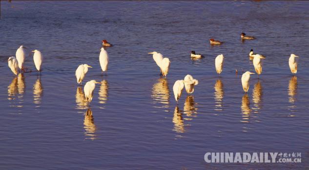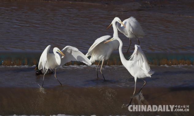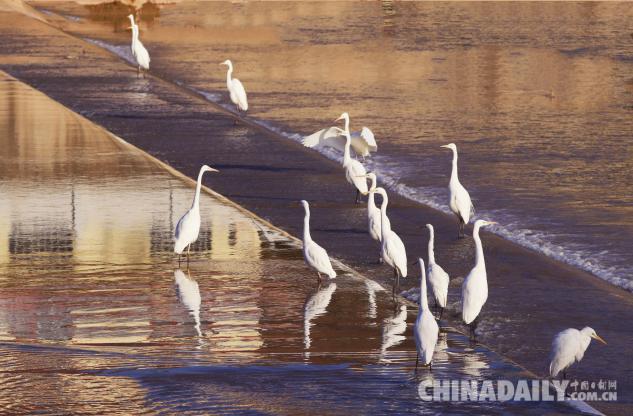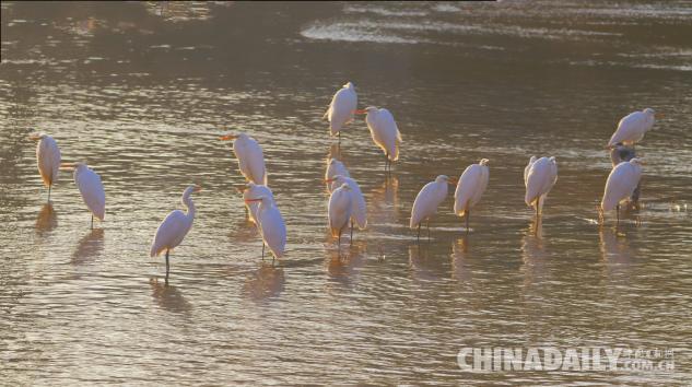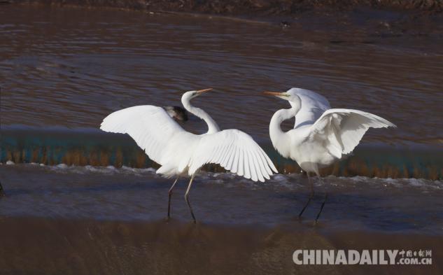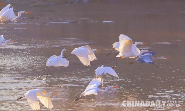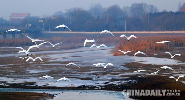 1月15日,數(shù)十只潔白的白鷺飛臨甘肅崇信城段的汭河,它們?cè)诖思Y(jié)安家。