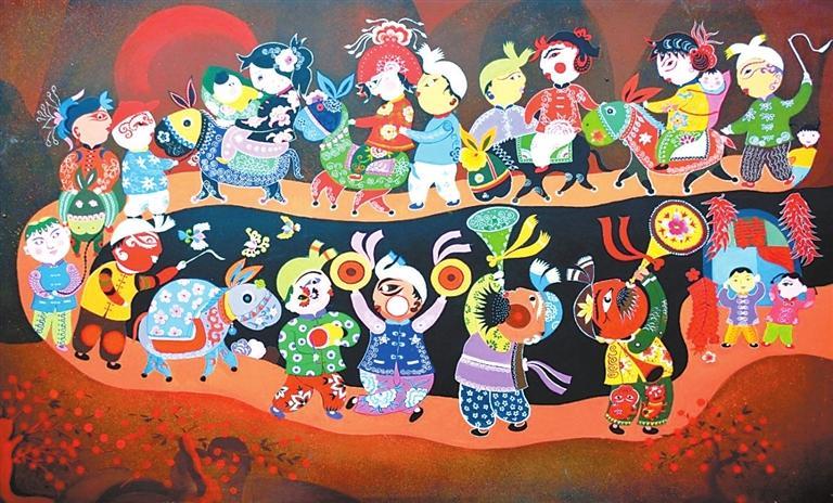 華池民間布貼畫是一種古老的民間工藝美術(shù),是隴東文化的重要組成部分。華池拼布創(chuàng)作以粗布為原料,色彩豐富鮮艷,剪貼的邊線明朗整潔,富有木刻版畫的刀木特點。其內(nèi)容多取材于人物、動物、花鳥等題材,注重色彩對比,以大紅大紫的色彩,夸張化的描述,追求強烈的直觀效果,講究裝飾性;風(fēng)格浪漫稚拙,渾厚質(zhì)樸,氣韻生動。