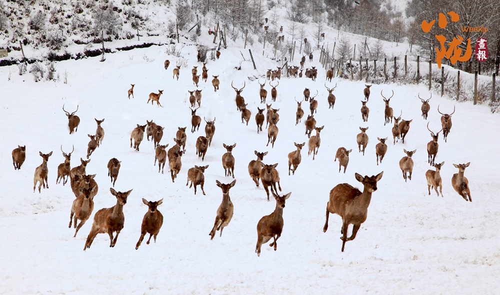 雪滿山川,素白沉靜。關灘溝鹿場的梅花鹿,在躲了一夜的風雪后成群結隊出來,或是雪中覓食,或是雪中撒歡,它們活潑的嬉戲好一幅祥和畫面。