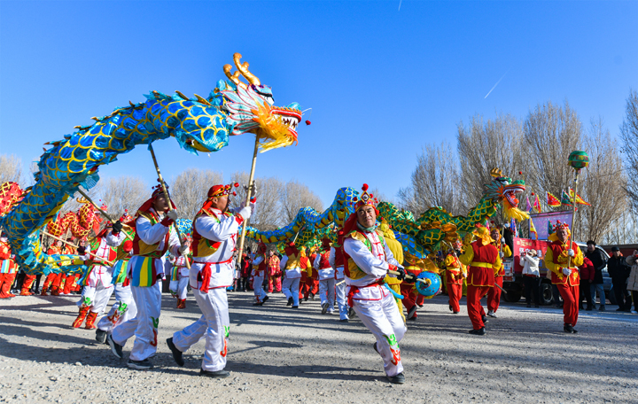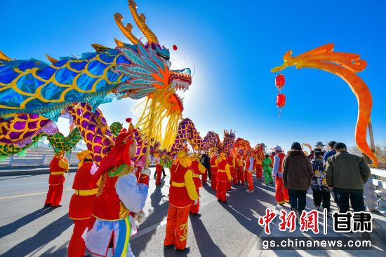 2024年2月14日,甘肅省敦煌市社火隊正在白馬塔景區(qū)進行社火——舞龍表演。