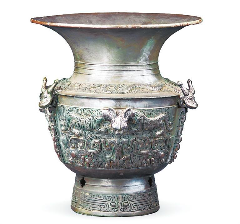 中國國家博物館收藏的龍虎紋青銅尊,高50.5厘米,重26.2千克,為一件體形較高大的盛酒器。青銅尊肩部以圓雕和浮雕相結(jié)合,塑造3條生動的蟠龍形象,龍身蜿蜒,龍首探出,額有雙角,闊吻巨口,兩眼大睜。腹部紋飾為一個(gè)虎頭兩個(gè)虎身,虎口之下有一人形,人頭銜于虎口之中?;⑸硐路揭造槔鉃榻纾梼少琮埾鄬M成的獸面。從主體花紋看,龍、虎、人造型莊嚴(yán)穩(wěn)重、奇特神秘,特別是龍頭和虎頭用澆鑄法從外壁突兀凸起,雄健粗獷,比起用高浮雕法更具有一種威武逼人的悍氣。龍虎尊圓形大口表示上天,肩部神龍游蕩于空中;猛虎張牙舞爪守護(hù)大地。龍虎尊的鑄造采用十八塊母范經(jīng)兩次焊接而成,渾然一體,毫無痕跡。整器工藝精湛,花紋線條洗練,是商代青銅器中的精品。
