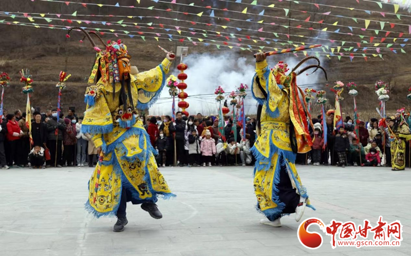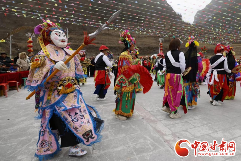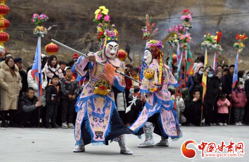 2024年2月19日,甘肅省隴南市武都區(qū)魚龍鎮(zhèn)柏家溝村,村民在表演當(dāng)?shù)靥厣珓》N、國(guó)家級(jí)非物質(zhì)文化遺產(chǎn)——高山戲。