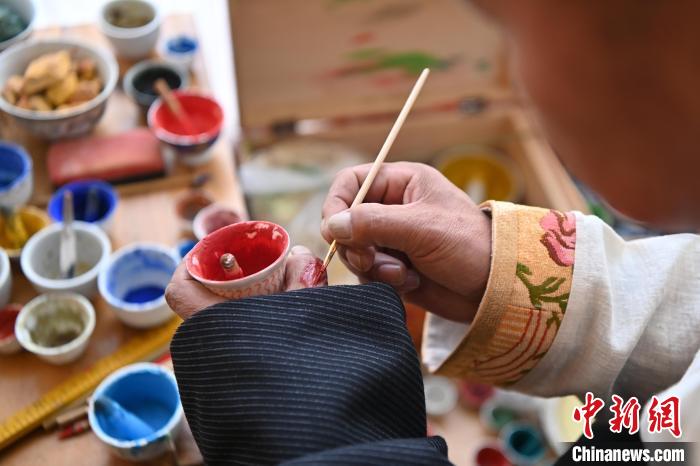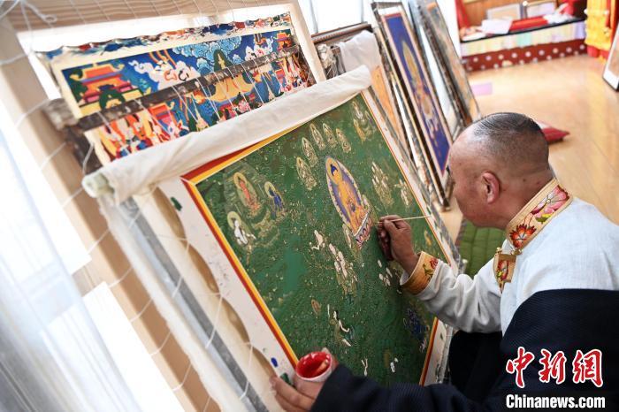圖為交巴加布在個(gè)人工作室內(nèi)給唐卡上色。一幅精美的唐卡作品,需要耗費(fèi)畫師幾個(gè)月甚至幾年時(shí)間。從勾線到著色,每一步、每一筆都要屏息凝神。九美旦增 攝