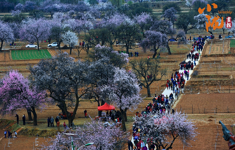 遠遠望去,到處是枝節(jié)橫生的杏樹,處處是農(nóng)家小舍,隱藏其中,人在花中,花在眼前。前來賞花的游客蜂擁而至,在杏園里駐足拍照,流連忘返。