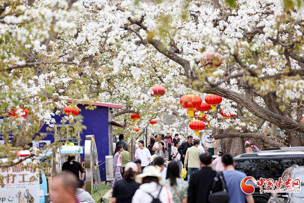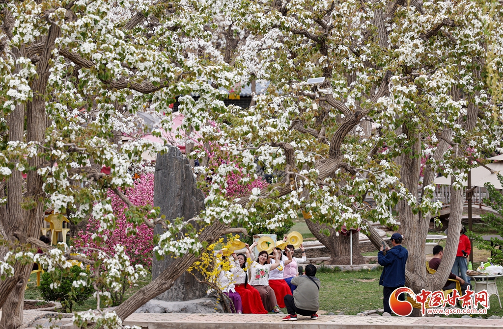4月13日,位于甘肅省蘭州市皋蘭縣什川鎮(zhèn)的百年梨園綻放如雪,吸引眾多游客前來(lái)踏青賞花。