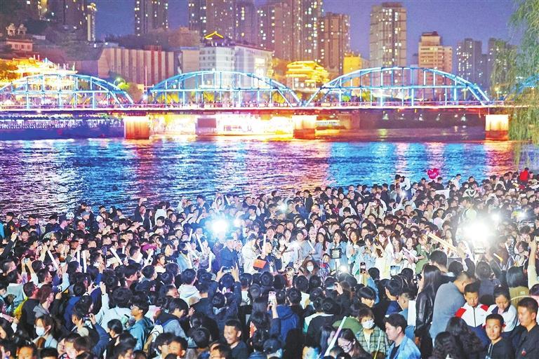 作為蘭州的地標之一,中山橋已經是來蘭游客必“打卡”的景點?;馃?ldquo;出圈”的“黃河大合唱”成為蘭州旅游新體驗。華燈初上,游客和市民齊聚黃河岸邊,隨著音樂齊聲合唱,場面壯觀,氣氛熱烈。“五一”假期首日,蘭州文旅市場迎來火爆“開門紅”,接待游客達到了86.42萬人次。