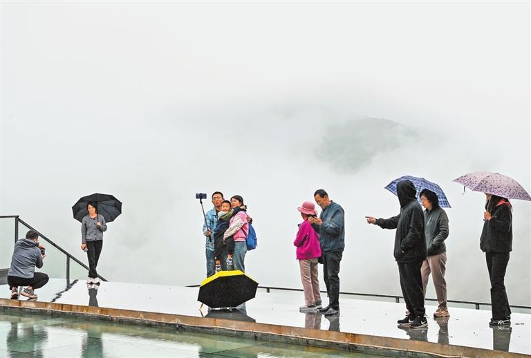 在綿綿細雨中,麥積奇峰時隱時現,吸引游客慕名而來感受“麥積煙雨”的魅力。新甘肅·甘肅日報記者 田 蹊