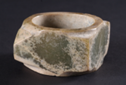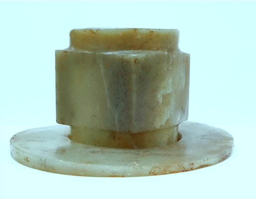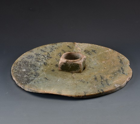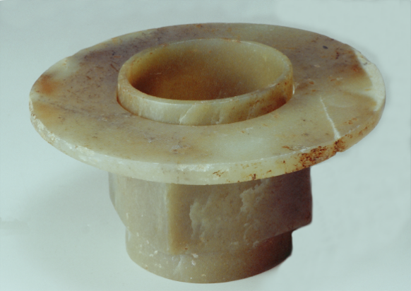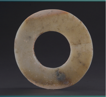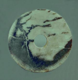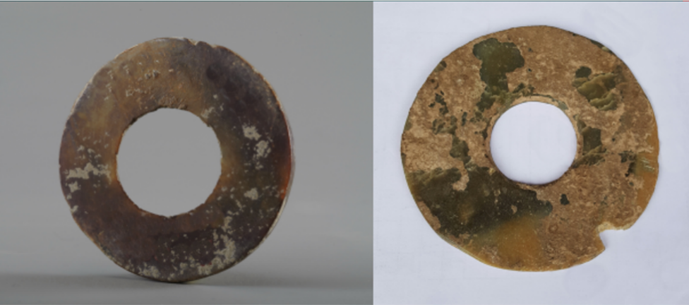 玉璧(編號(hào)總0129:5)直經(jīng)9厘米,單面鉆孔,大端孔徑4.4厘米,小端孔徑4厘米,厚度0.55—0.7厘米,璧外緣有磕碰痕。