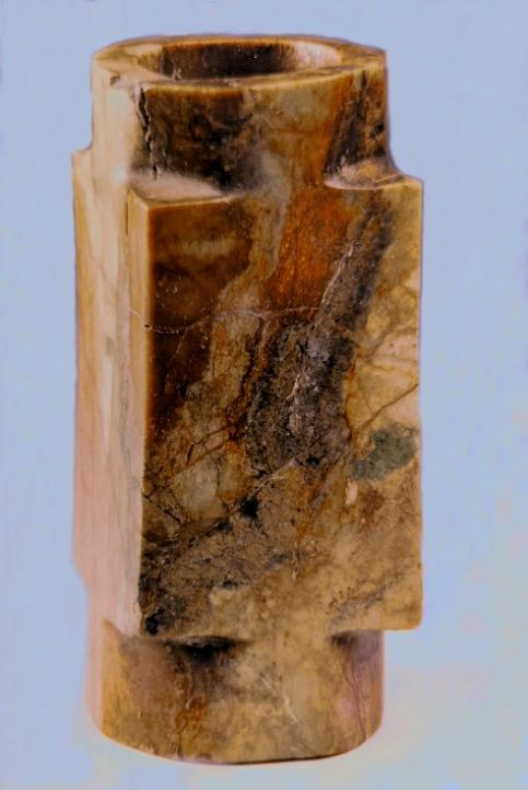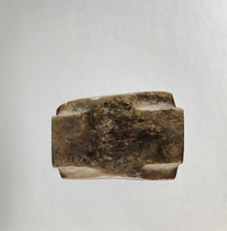 玉琮(編號(hào)總0128:1)高4~4.2厘米,外方邊長(zhǎng)6.1~6.3厘米,內(nèi)徑5.2厘米,上端射較長(zhǎng),下端射極短,形制原始古樸,切割改制的現(xiàn)象明顯。