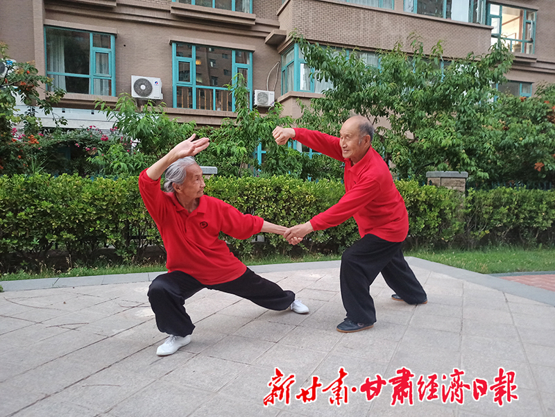 崆峒山下,綠地廣場,90歲的岳起中和87歲的張煒英帶領(lǐng)一眾弟子以颯爽的英姿、矯健的步履完成了一套崆峒太極拳。