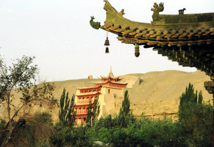 從20世紀70年代末開始,大量先進科技不斷被引入敦煌石窟保護。新技術(shù)、新材料、新手段的不斷運用,豐富了敦煌遺產(chǎn)的保護技術(shù)和保護手段,有效改變了石窟內(nèi)部及其環(huán)境的保護狀況,使敦煌遺產(chǎn)的保護工作從原來的搶救性保護,過渡到了科學(xué)保護階段。圖為透過敦煌莫高窟前的牌樓一角望去,敦煌莫高窟標志性建筑九層樓依舊雄偉壯觀。新華社記者梁強攝(2004年10月25日發(fā))